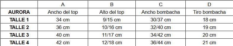 - Talle 1: 85 de busto, talle 2: 90 de busto, talle 3: 95 de busto, talle 4: 100/105
