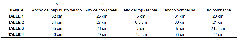 - La medida del alto del top refiere el largo desde la parte superior del bretel, hasta la parte inferior del busto