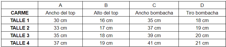 - Talle 1: 85 de busto, talle 2: 90 de busto, talle 3: 95 de busto, talle 4: 100/105