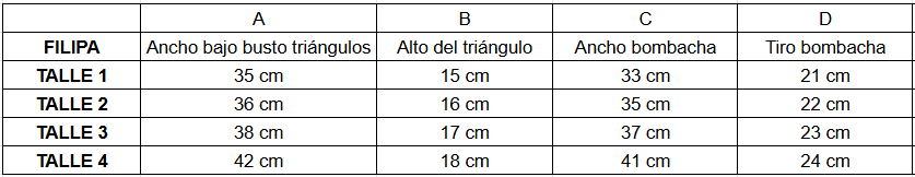 - Talle 1: 85 de busto, talle 2: 90 de busto, talle 3: 95 de busto, talle 4: 100/105