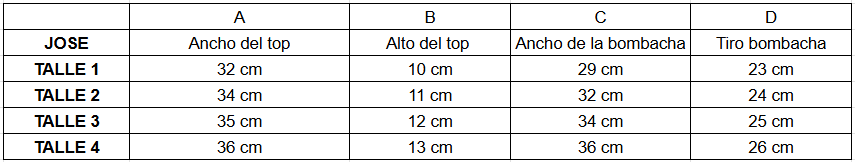 - Talle 1: 85 de busto, talle 2: 90 de busto, talle 3: 95 de busto, talle 4: 100/105