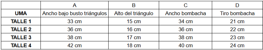 - Talle 1: 85 de busto, talle 2: 90 de busto, talle 3: 95 de busto, talle 4: 100/105