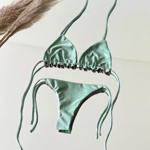 Conjunto de bikini reversible. Triángulo movible con tiras para atar. Bombacha estilo semiless embolsada.